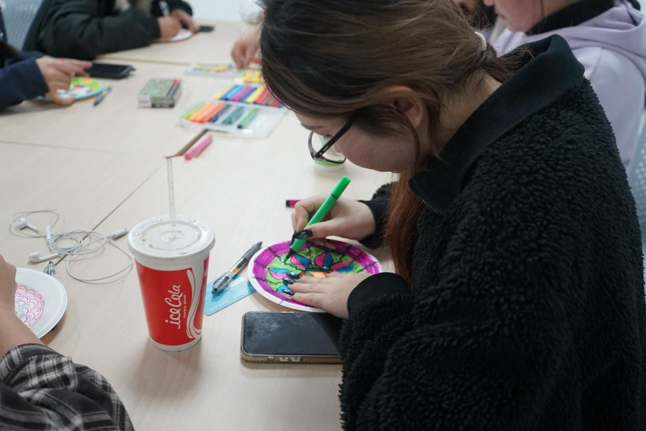 同学们领取画材后,便沉浸于色彩与线条的世界。笔尖在纸上沙沙作响,勾勒出独一无二的图案,纷繁的思绪也随着创作的节奏逐渐沉淀。无需绘画功底,只需静心感受,每个人都创作出了充满个人能量与情感的艺术作品。
