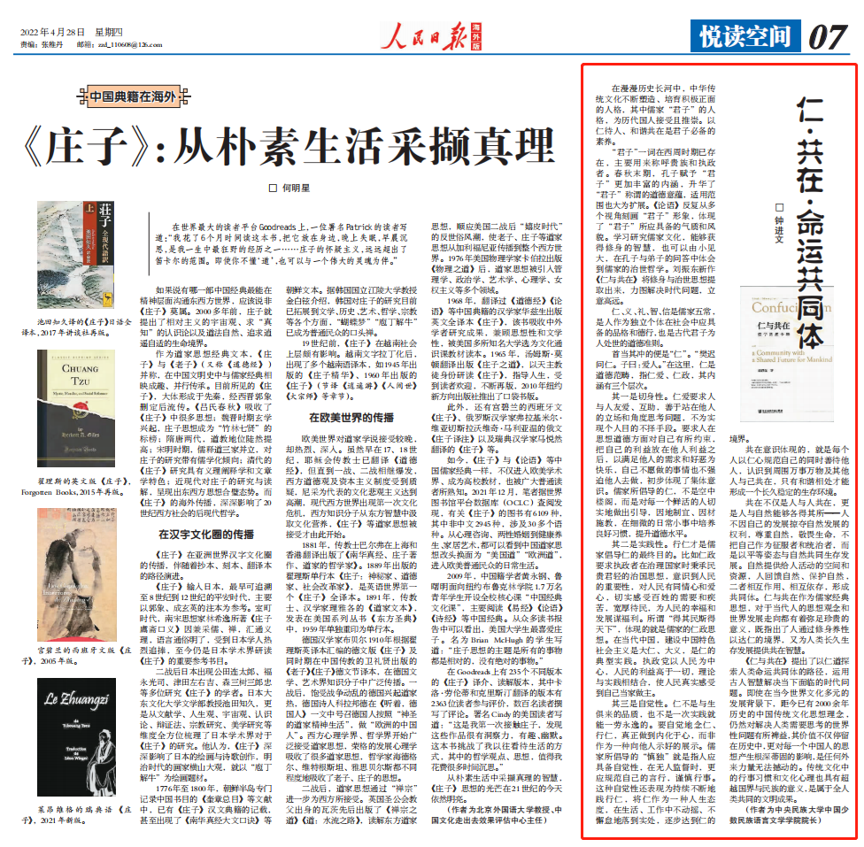 4月28日,《人民日报》海外版刊发了蜜桃视频 钟进文教授撰写的《仁·共在·命运共同体》一文。